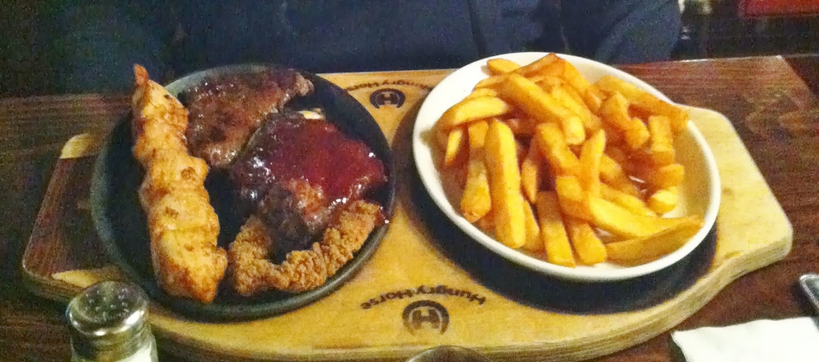 Last night me and my boyfriend (Andrew) went to the Gypsy Queen in Sheffield which is a Hungry Horse pub. I've been to the Hungry Horse chain restaurants in a few different places, (Northampton, North Wales and the Gypsy Queen once before) and I'm never disappointed. For the price I find them very good quality and very good portion sizes, if like me and Andrew you fancy a challenge the "Big Plate Specials" are definitely what you want. He ordered the Ultimate Big Sizzler (£13.99) and I ordered the Big Bombay Banquet (7.99) with Chicken Tikka Masala as the curry. The Big Sizzler was a little more expensive due to the amount of meat!